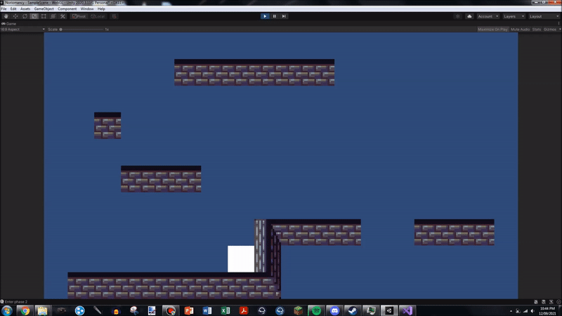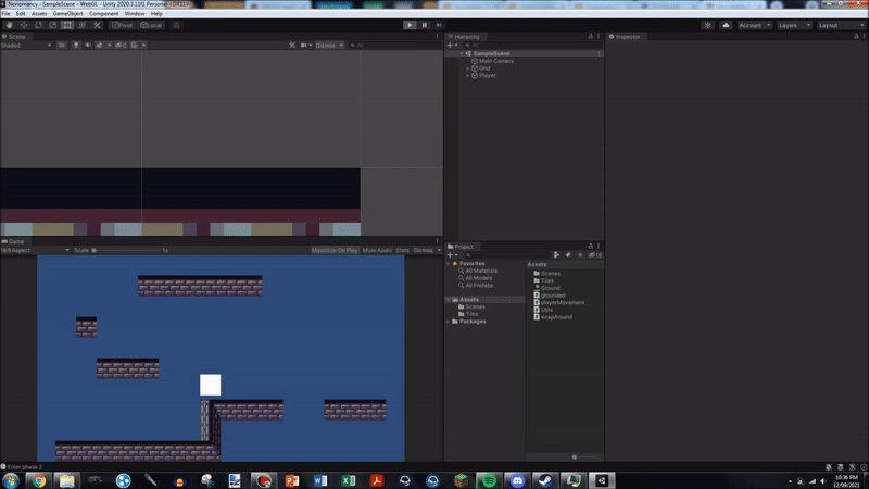 The world is made by tilemap, and it was nice to get back in touch with tilemaps a little, as I intend to use them for building the rest of the game's levels (No, I will not be taking questions on the implications of getting back in touch with something only to use it, the tilemap system is not a person, it does not necessitate ethical consideration). The implementation here was very basic, and reused assets from the tutorials earlier in semester. Notably, the collision for the tilemap needed to be set to polygon to fix a few bugs around clipping into the floor.